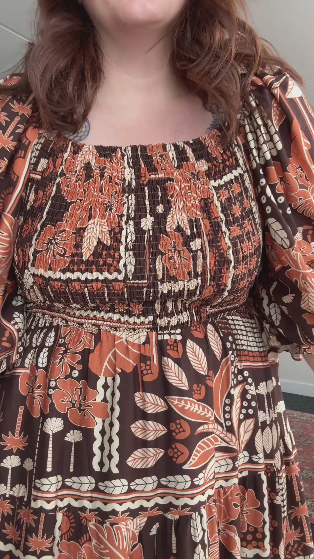The Kailani Maxi from Mr. Friday Flamingo’s Pasifika range is bold, beautiful, and designed to celebrate culture with style. Featuring a striking Pasifika print in earthy brown, orange, and cream tones, this maxi blends effortless comfort with standout design. The shirred bodice, floaty sleeves, and tiered silhouette create a flattering fit that’s as easy to wear as it is eye-catching. A matching fabric belt completes the look — wear it to cinch the waist for extra shape or leave it off for a more relaxed vibe.