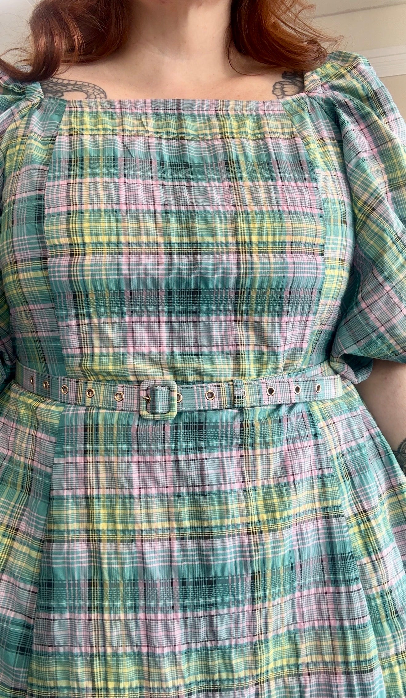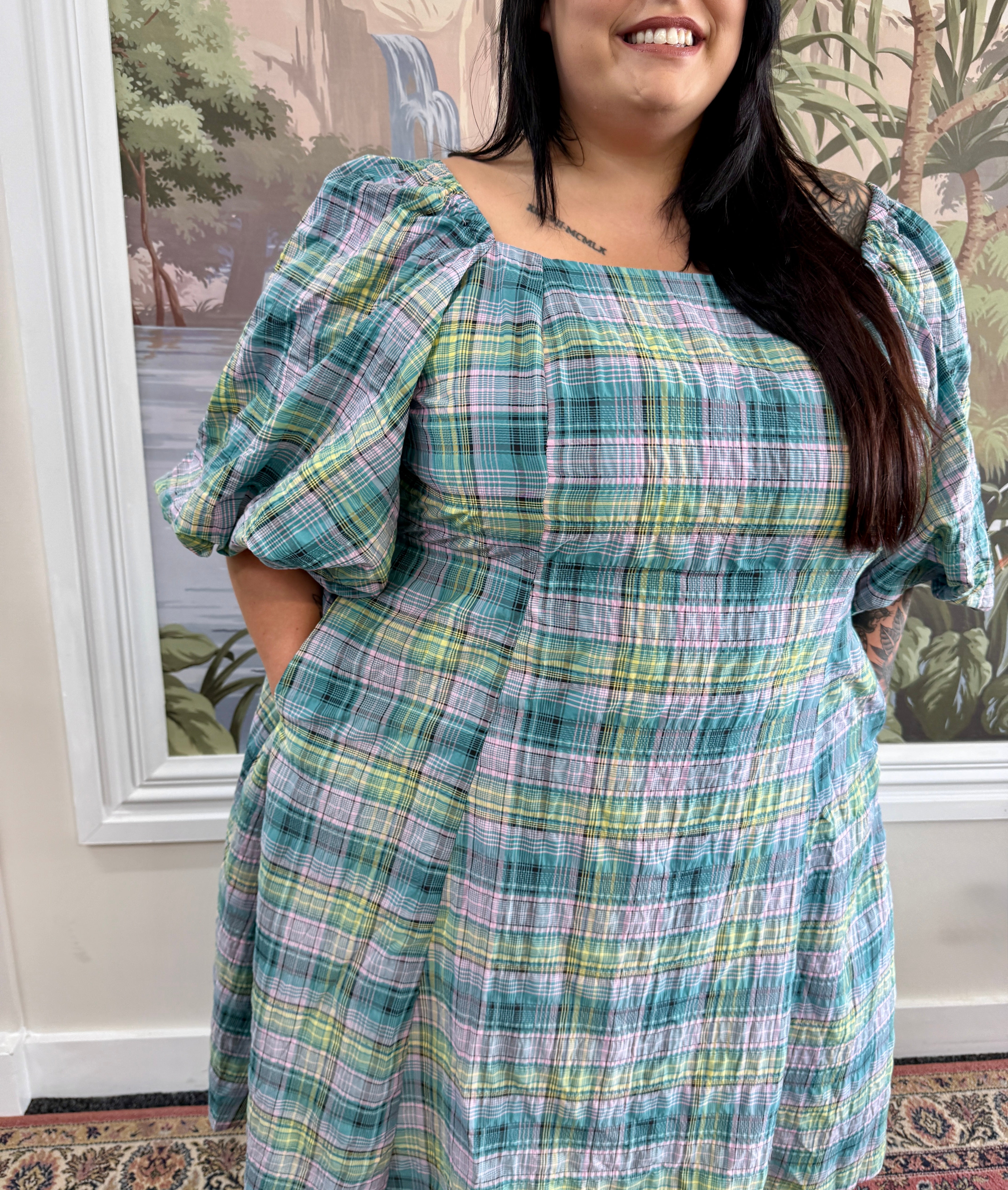The fresh check pattern adds colour and personality to your wardrobe while the seersucker texture gives the dress a light, breathable feel. The shape skims comfortably over the body, creating an easy, flattering silhouette that works for everyday wear, events, or dressing up with your favourite accessories.