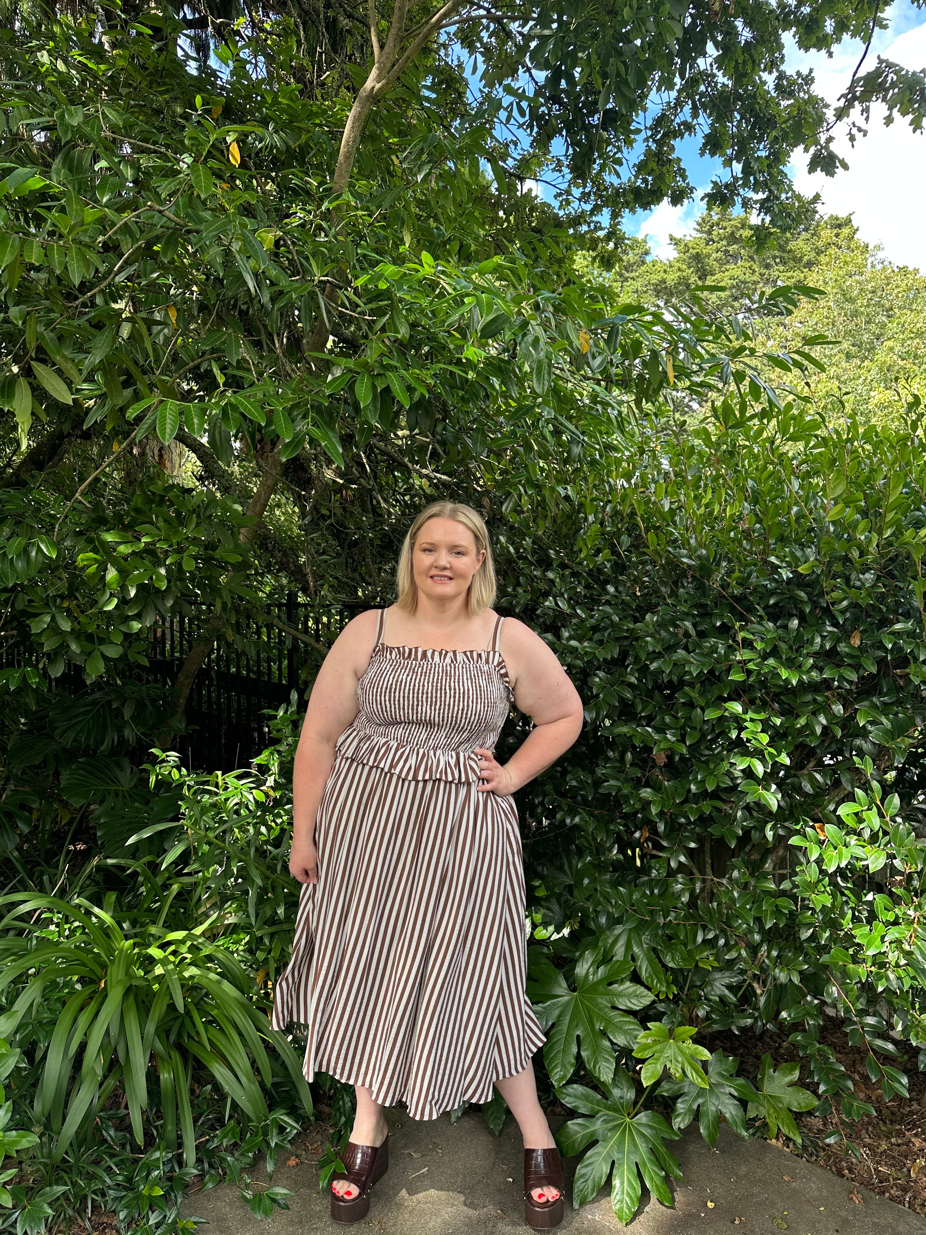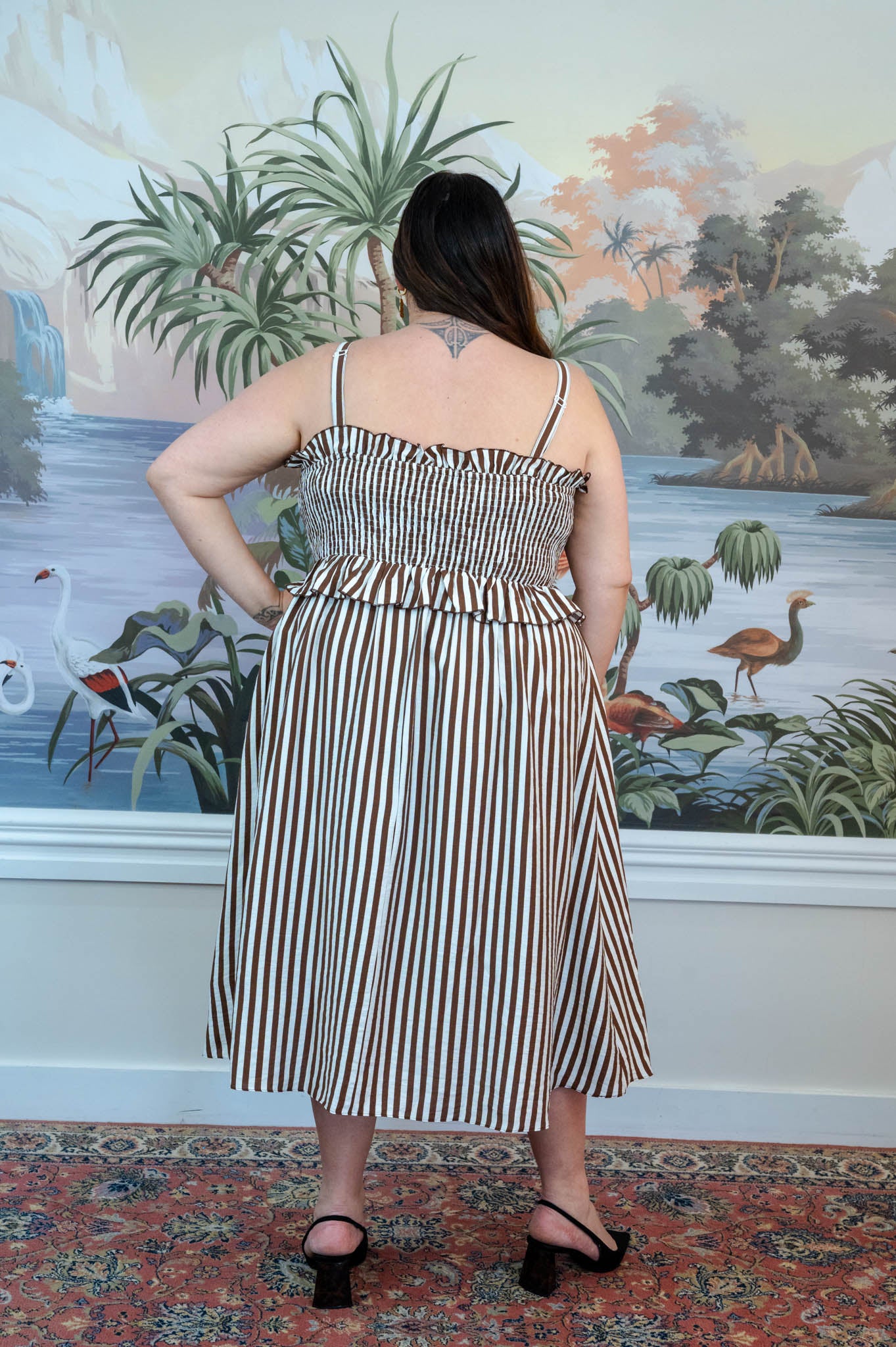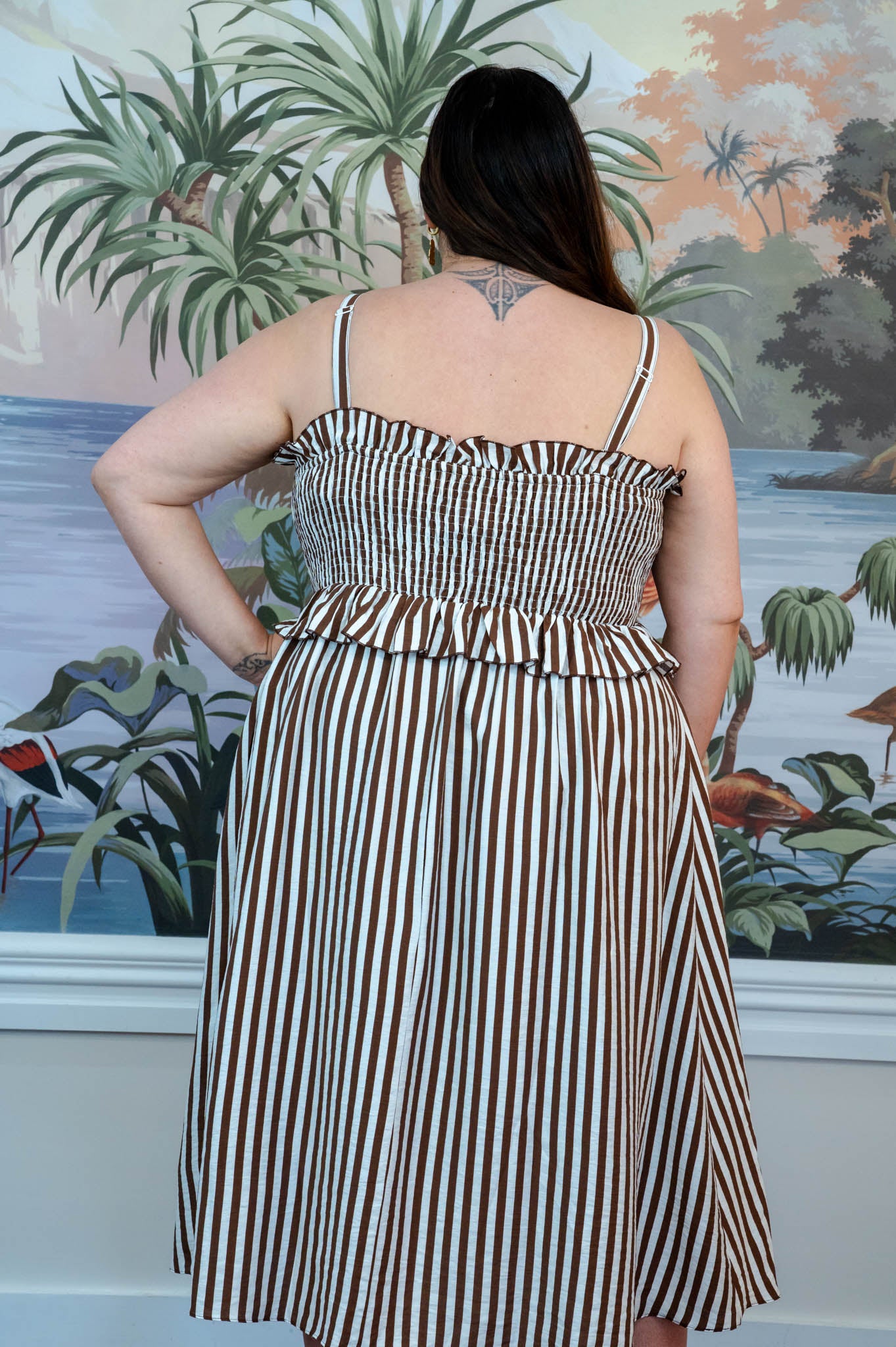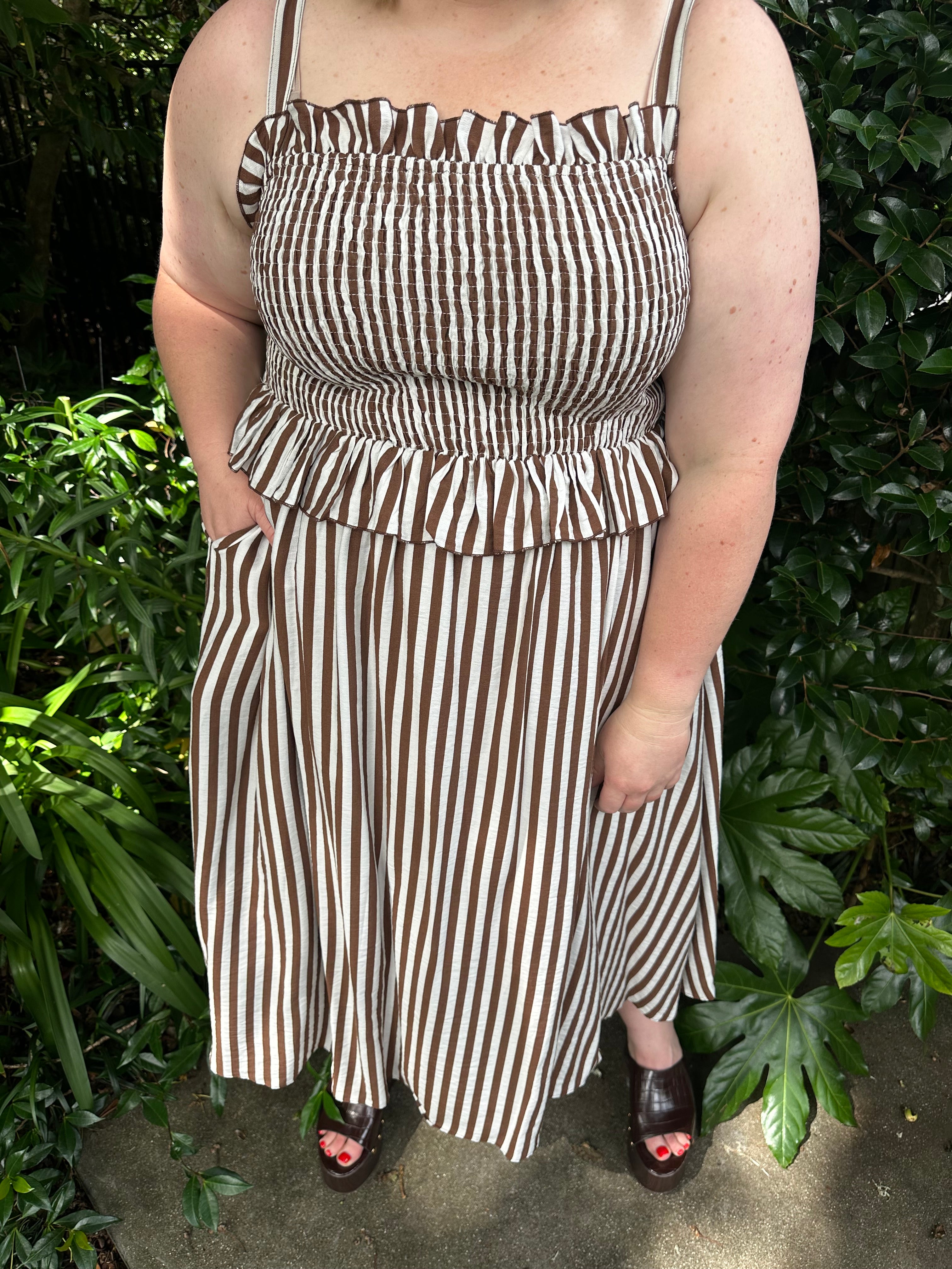 The rich chocolate and cream stripe gives this piece a timeless feel while still being easy to style with sandals, boots, or platforms depending on the season.
