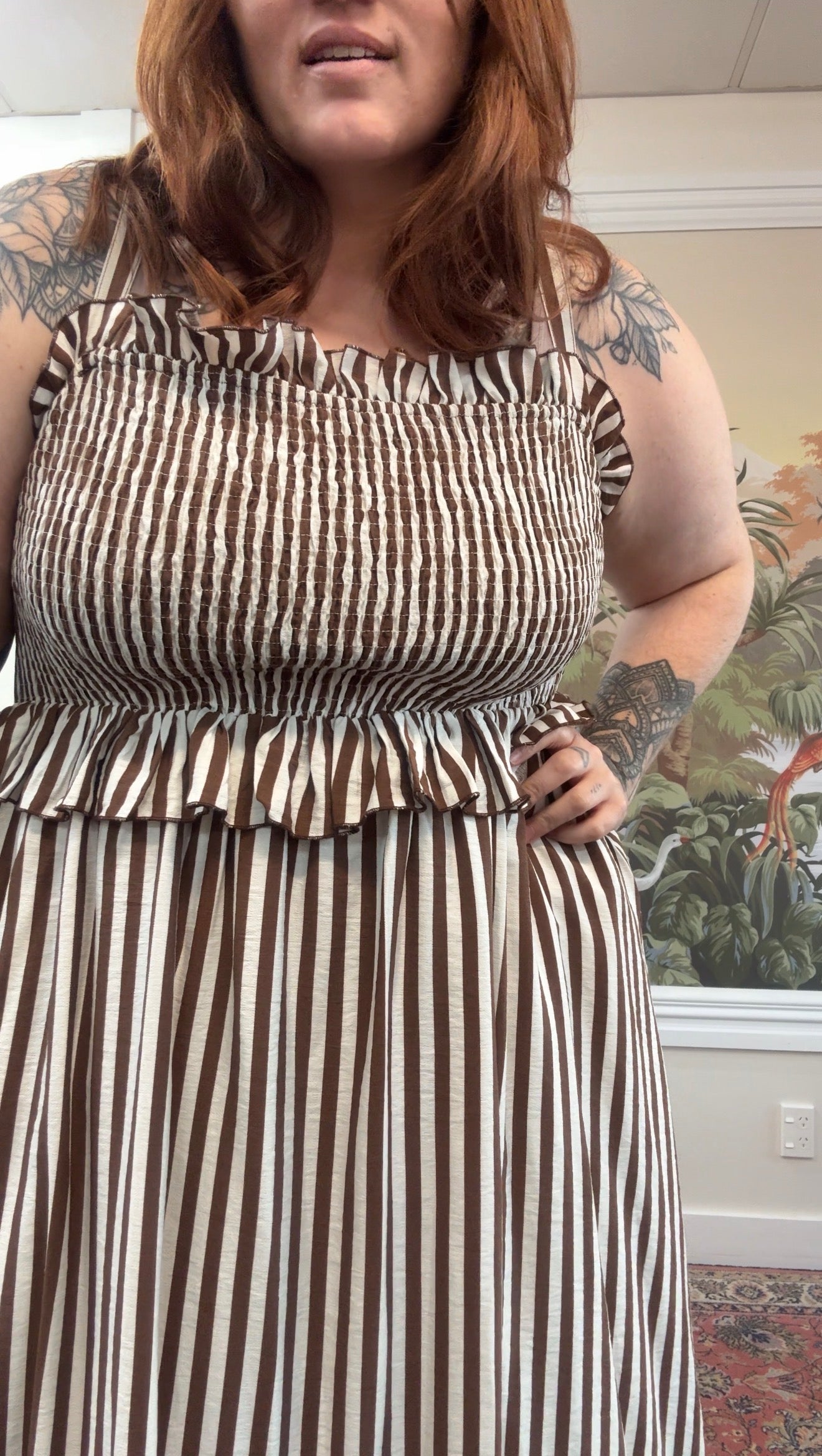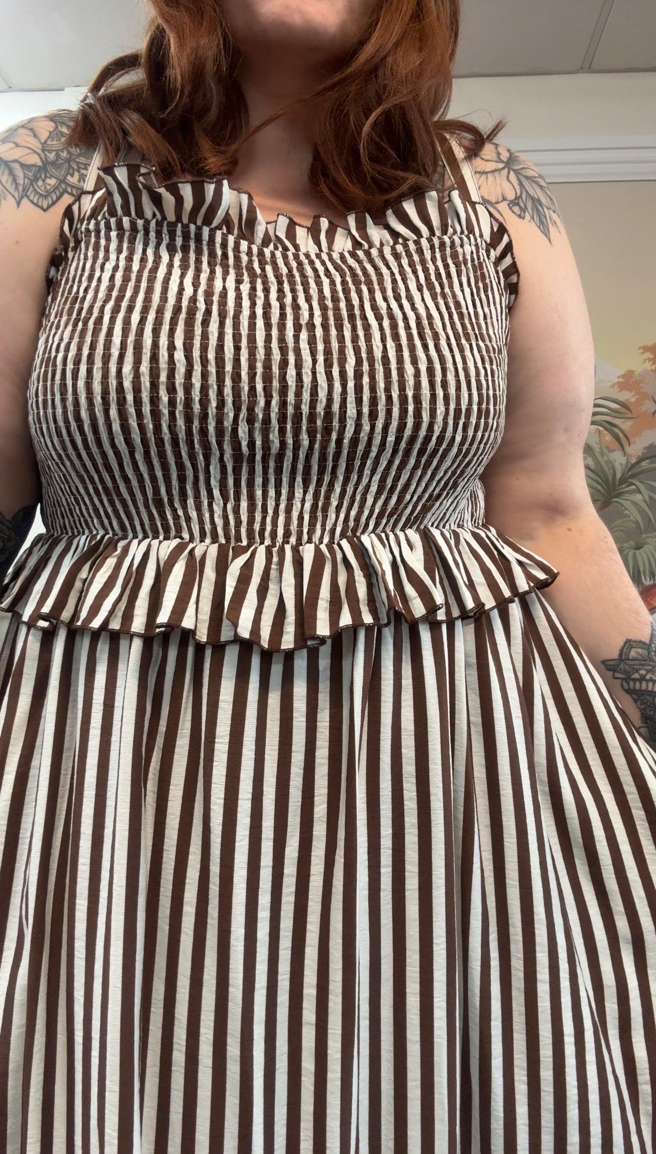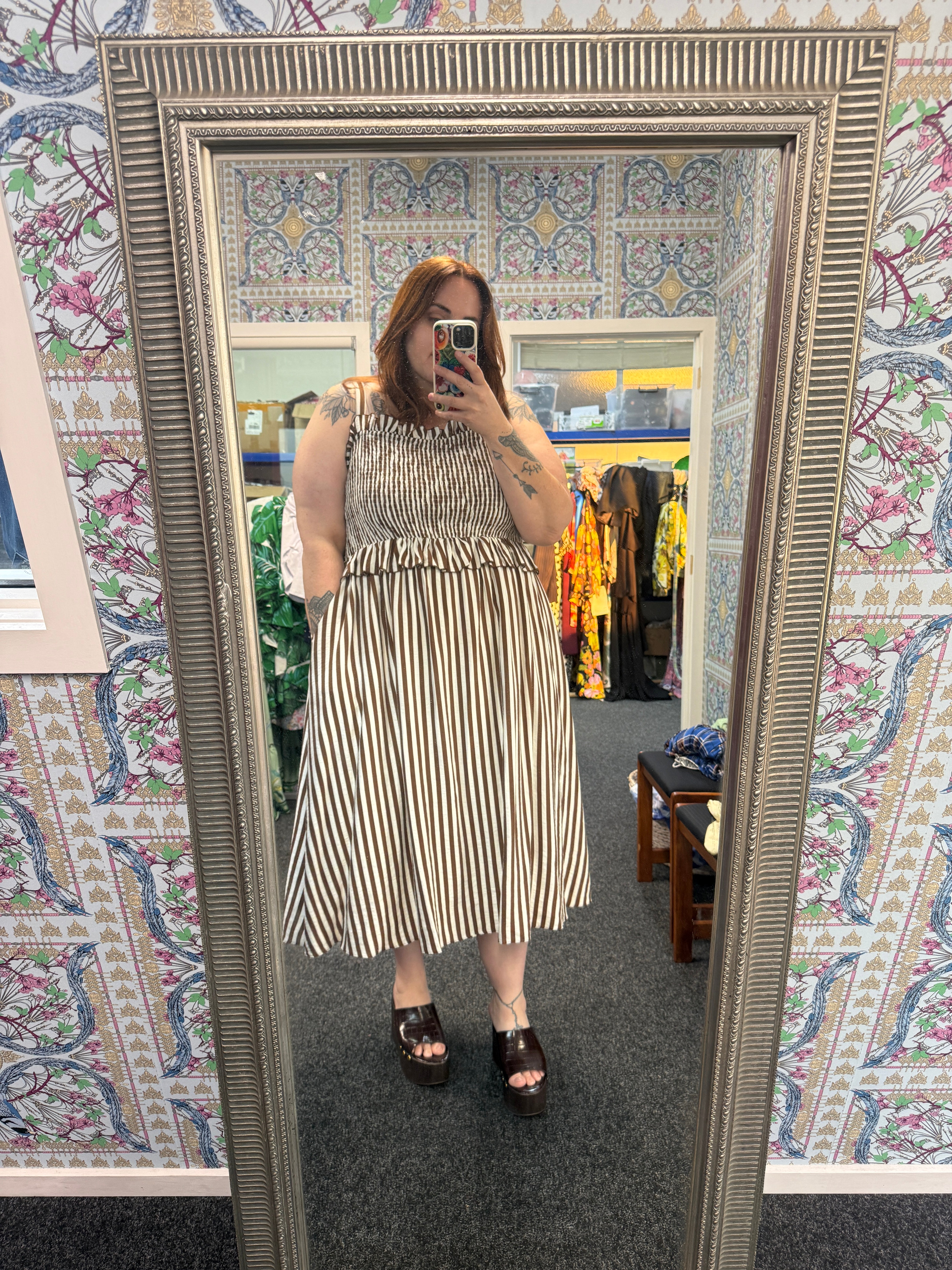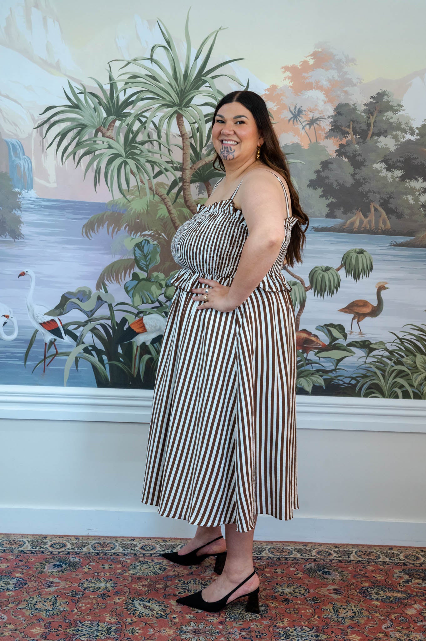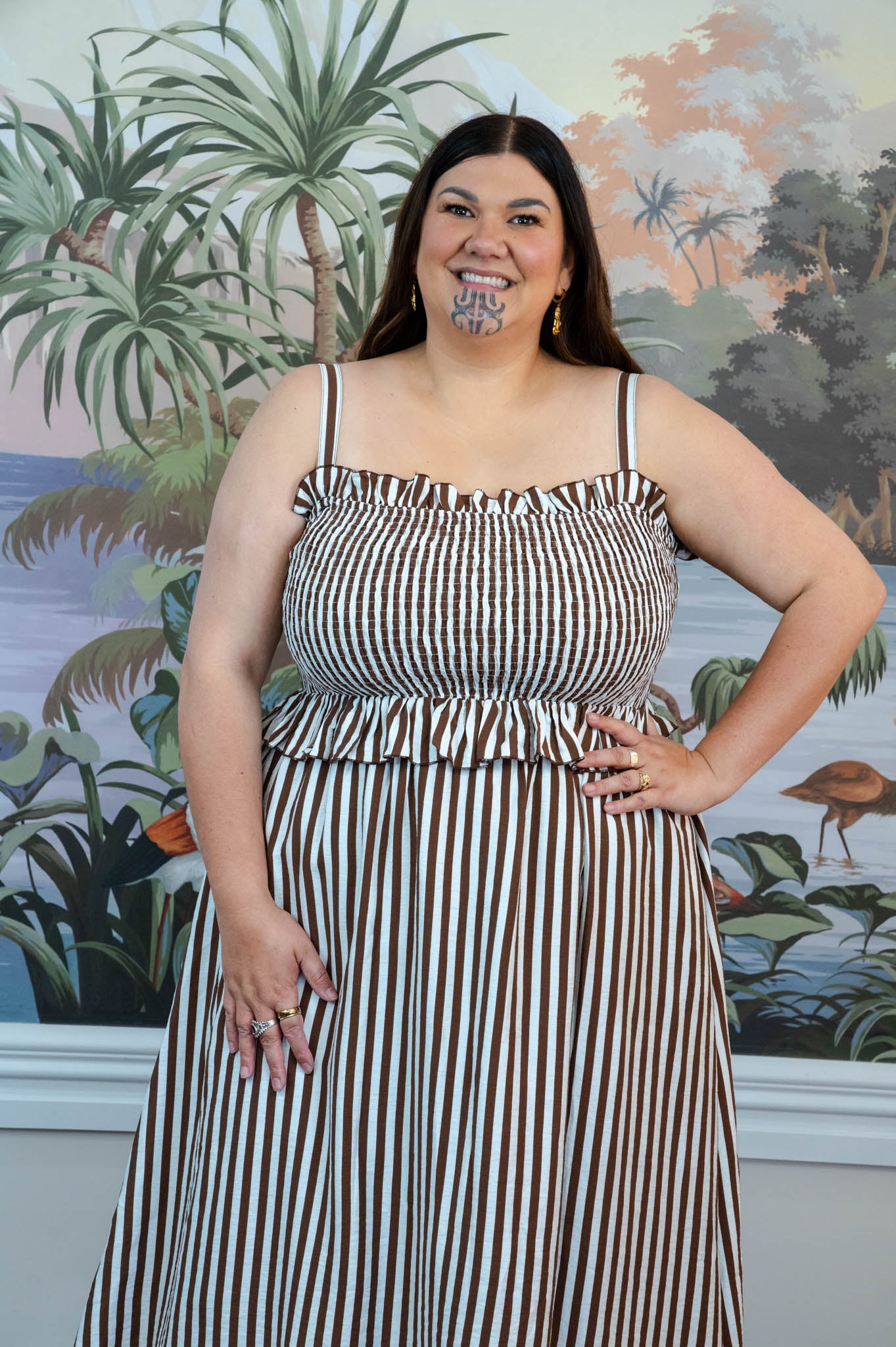 The rich chocolate and cream stripe gives this piece a timeless feel while still being easy to style with sandals, boots, or platforms depending on the season.