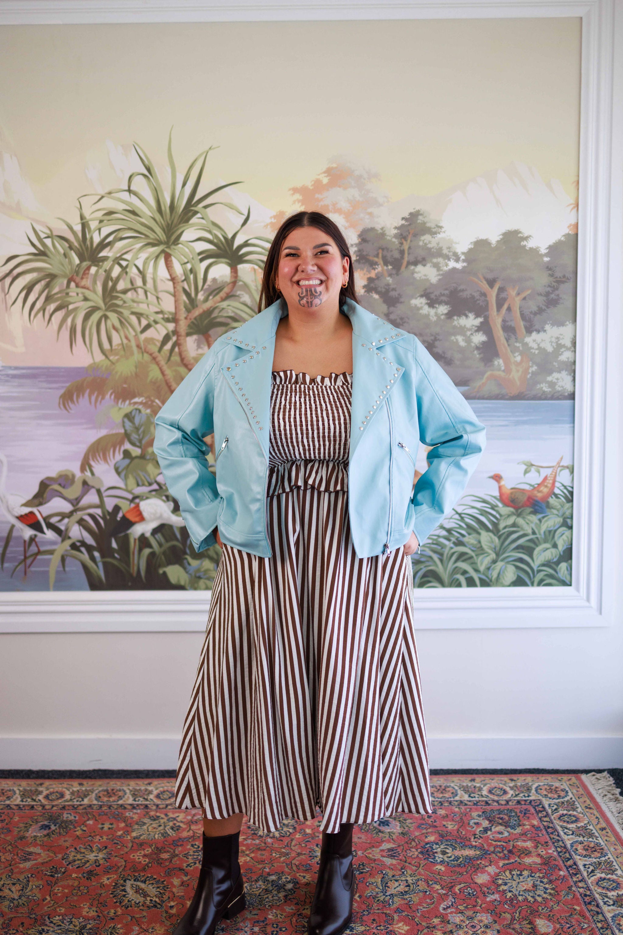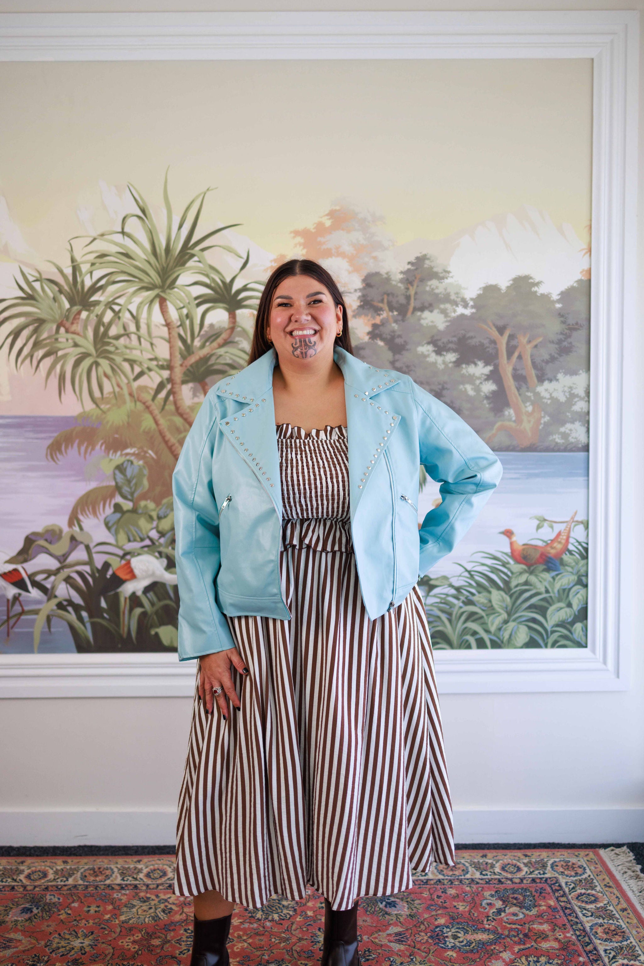 Made from high-quality faux leather with a touch of stretch, it feels soft and comfortable while still holding its shape beautifully. The relaxed biker silhouette makes it easy to layer over dresses, tops or knitwear, making it a versatile piece for changing seasons.