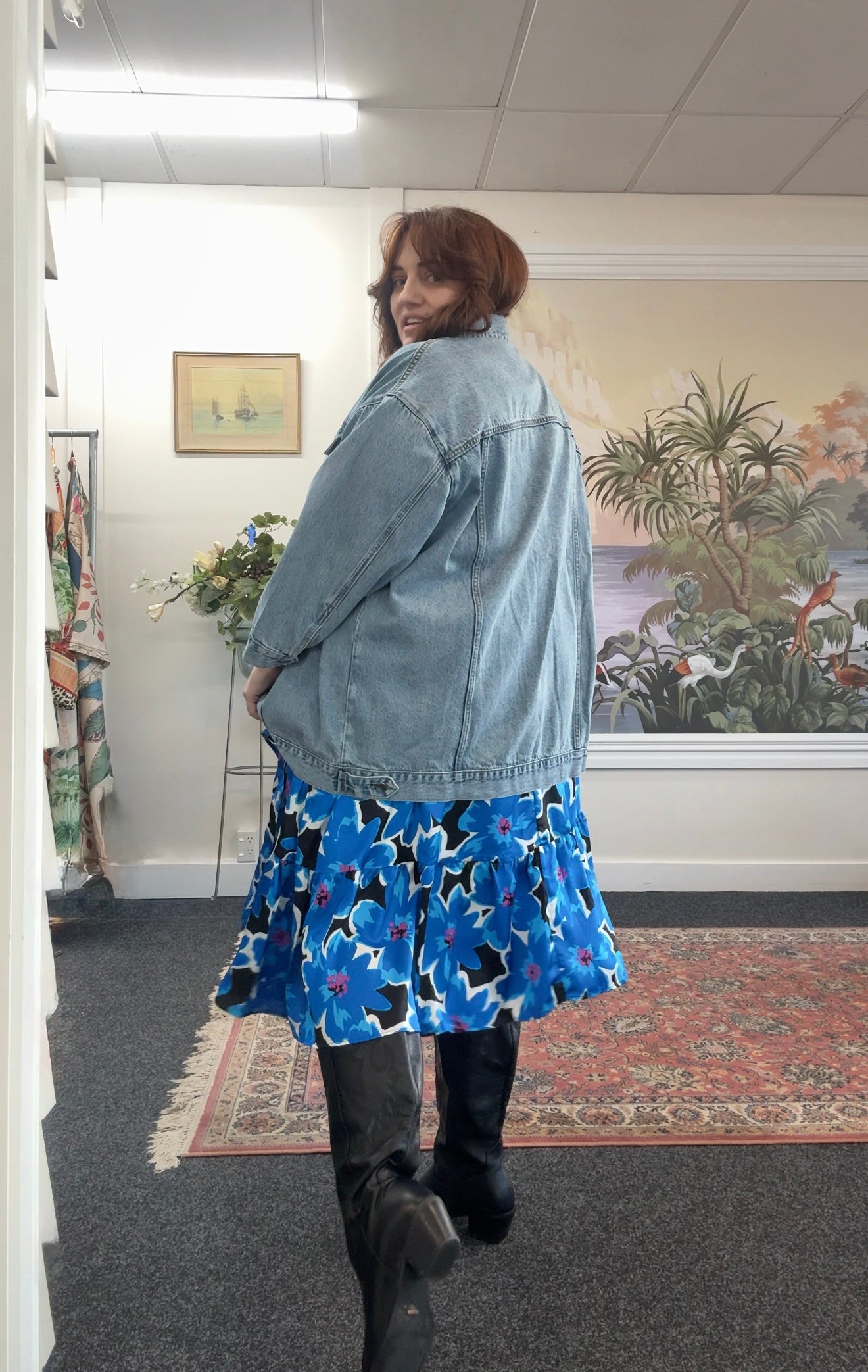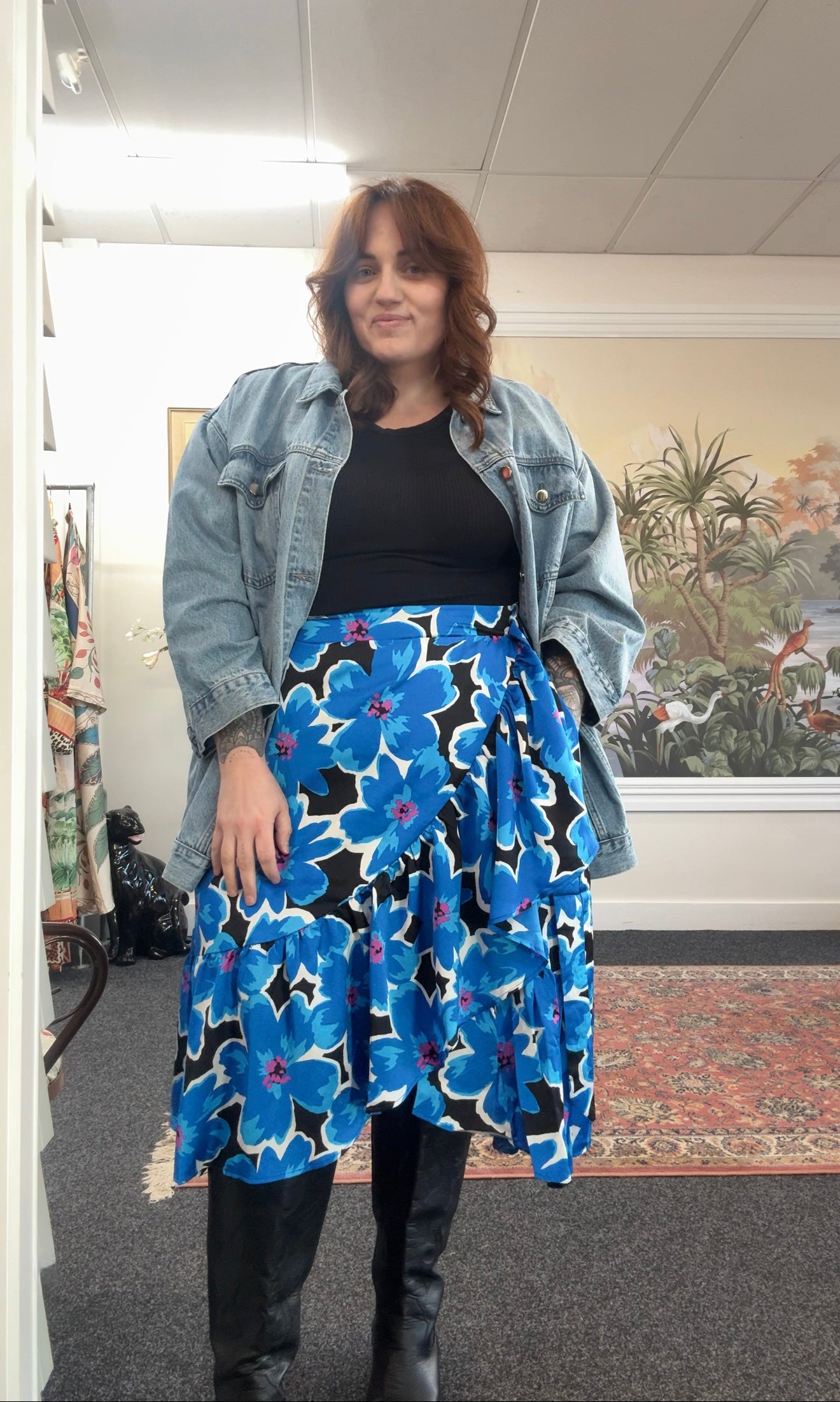 Our stunning midi skirt with a vibrant blue retro floral print is versatile for any occasion, whether you're catching up with friends over brunch, running errands, or enjoying a night out. Its elasticated back waistband ensures a flattering fit that effortlessly complements your curves.