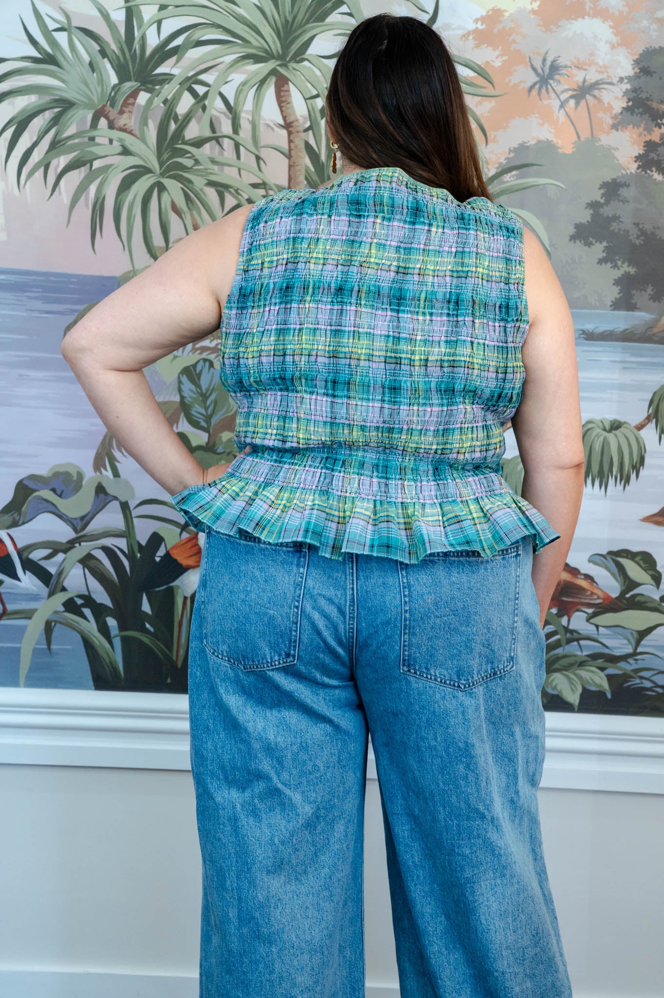 The peplum hem creates a feminine silhouette that pairs perfectly with jeans, skirts, or the matching Aria skirt for a coordinated outfit.