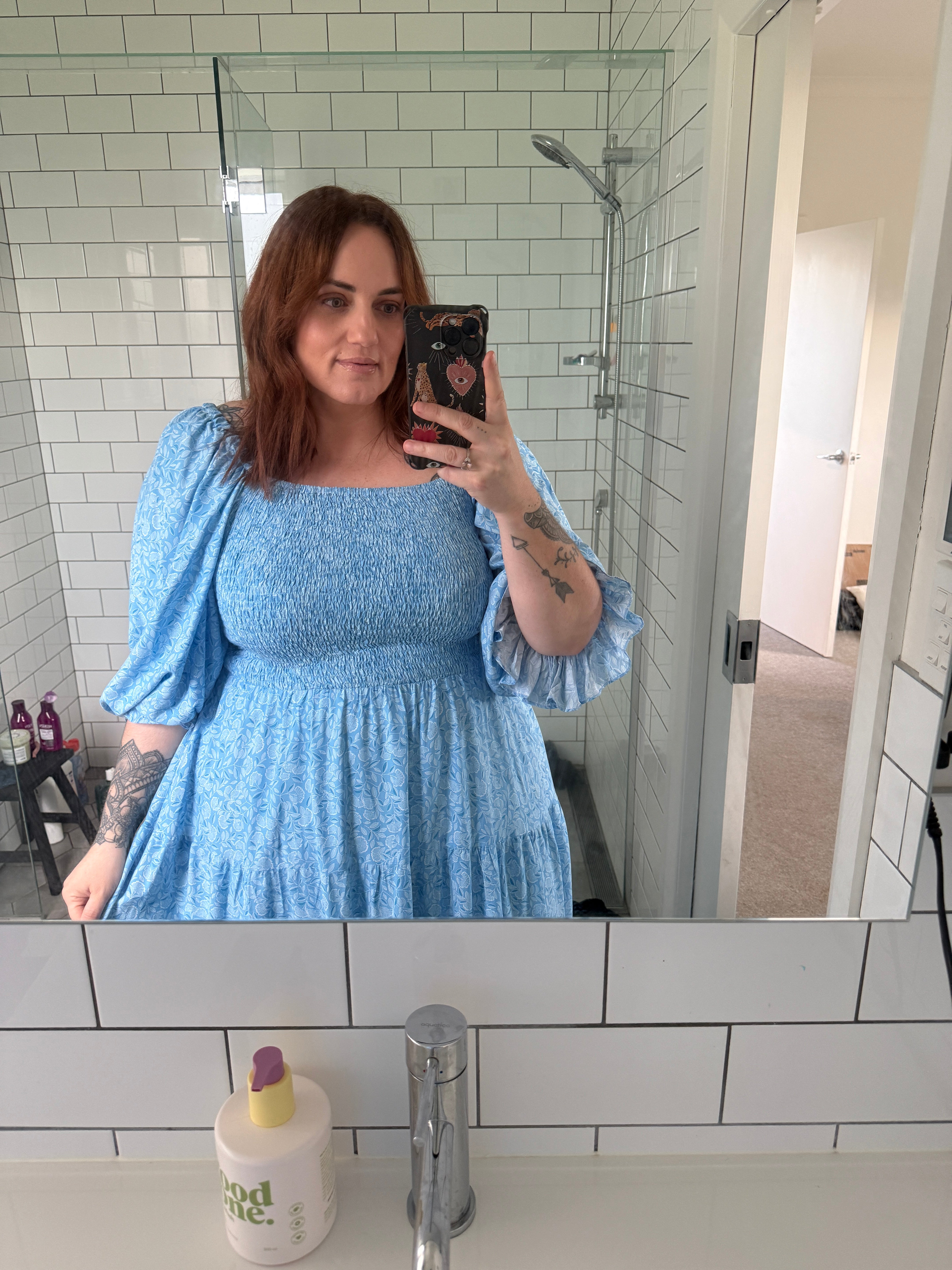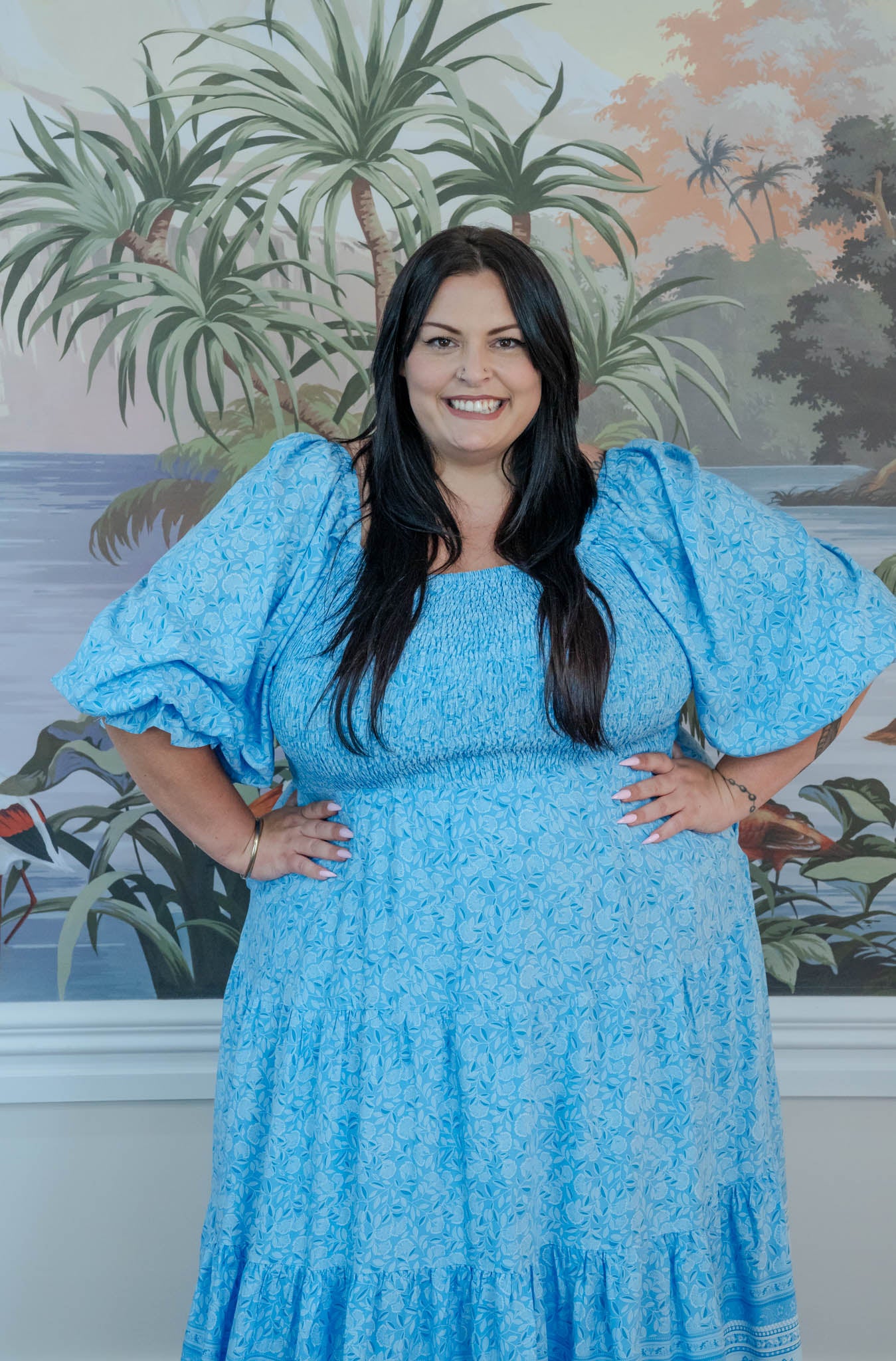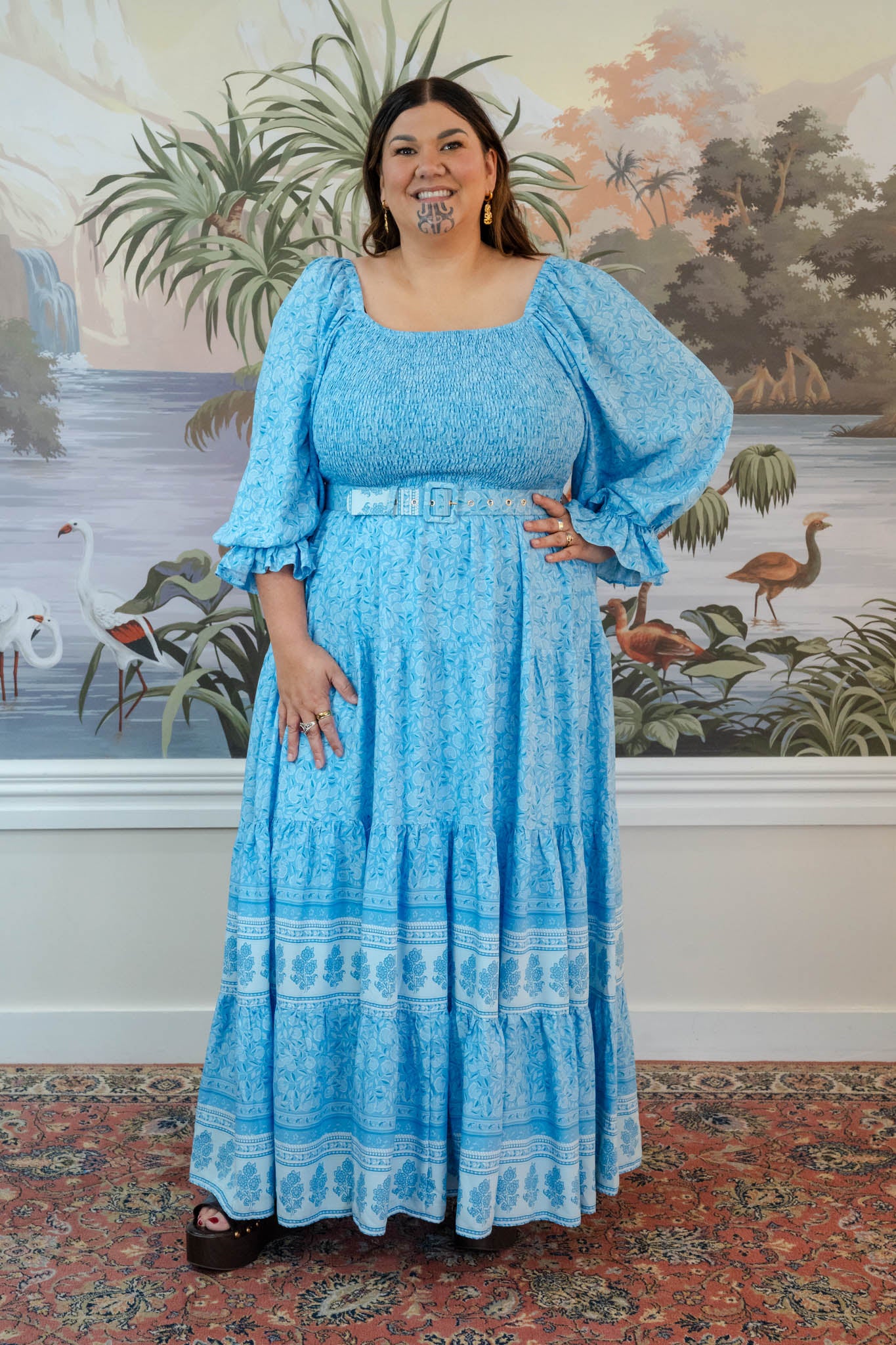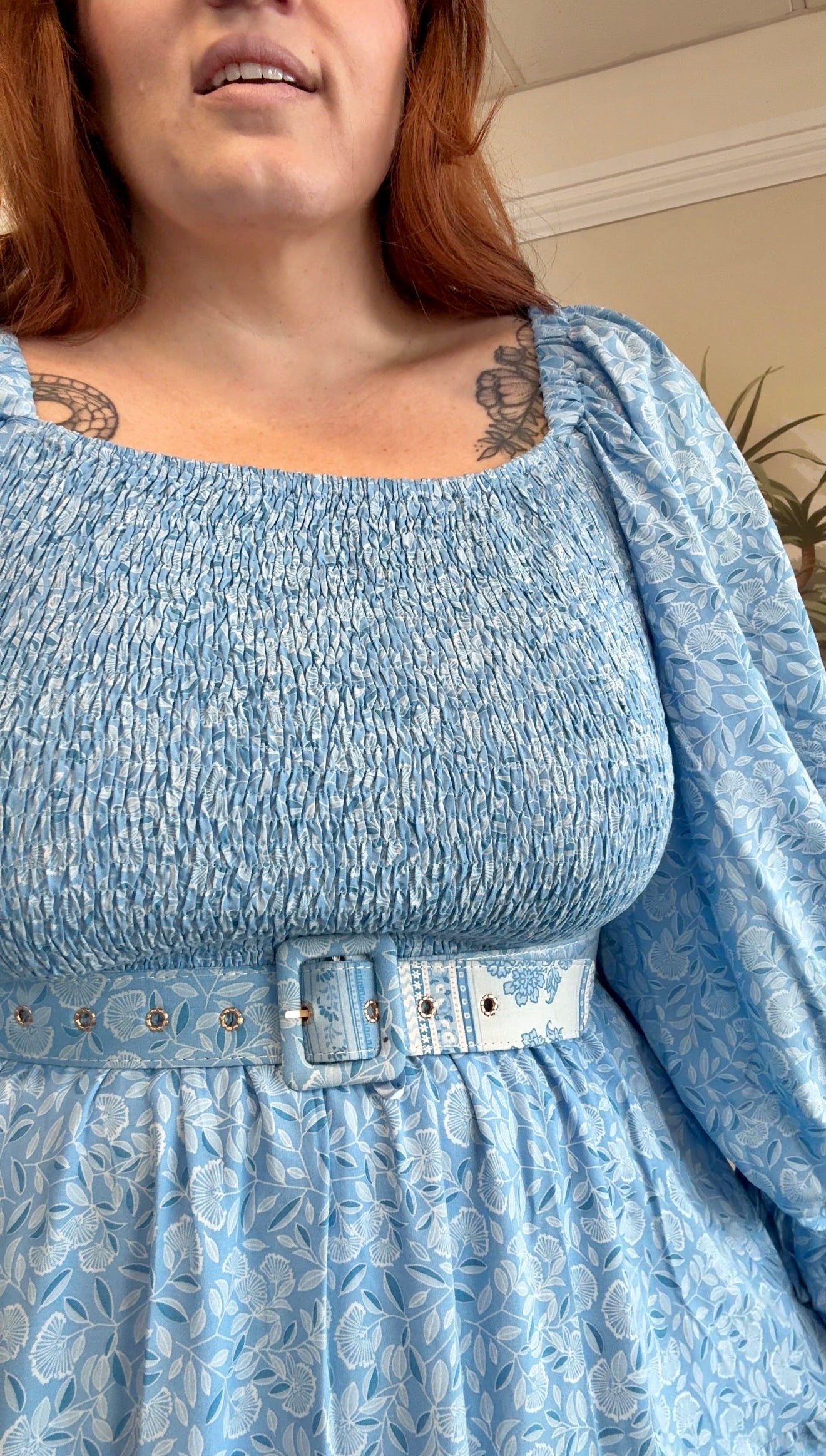 Featuring a fully shirred bust at both the front and back, this style offers stretch and flexibility through the upper body while still sitting comfortably and securely. The flowing skirt and relaxed silhouette make it an effortless piece you can wear for everyday or dress up when needed. Finished with soft statement sleeves and a matching self fabric belt.