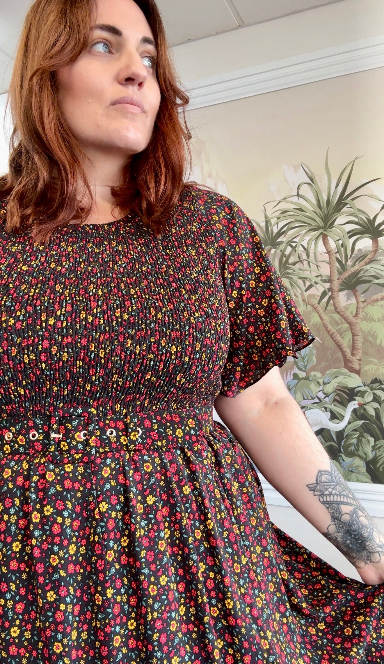 Featuring a shirred bust at the front, this style offers comfortable stretch through the chest while the back remains smooth for a clean, flattering fit. The relaxed skirt and soft movement make it an effortless throw on piece you can wear casually or dress up when needed. Finished with a tie and keyhole detail at the back of the neck and a matching belt.